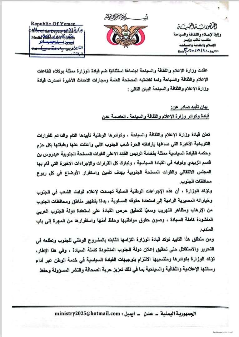 وانطلاقًا من هذا التأييد، تؤكد قيادة الوزارة التزامها الثابت بالمشروع الوطني الجنوبي، وتمسّكها بخيارات شعب الجنوب وتطلعاته في التحرير والاستقلال، حتى تحقيق إعلان دولة الجنوب المنشودة كاملة السيادة. وفي هذا الإطار، تؤكد الوزارة، بكوادرها ومنتسبيها، التزامها بتوجيهات القيادة السياسية في خدمة المواطن، عبر أداء رسالتها الإعلامية والثقافية والسياحية، بما في ذلك تعزيز حرية الصحافة والنشر المسؤول، وحفظ التراث الوطني، والنهوض بالقطاع السياحي، انطلاقًا من المسؤولية الوطنية والتاريخية الملقاة على عاتقها.