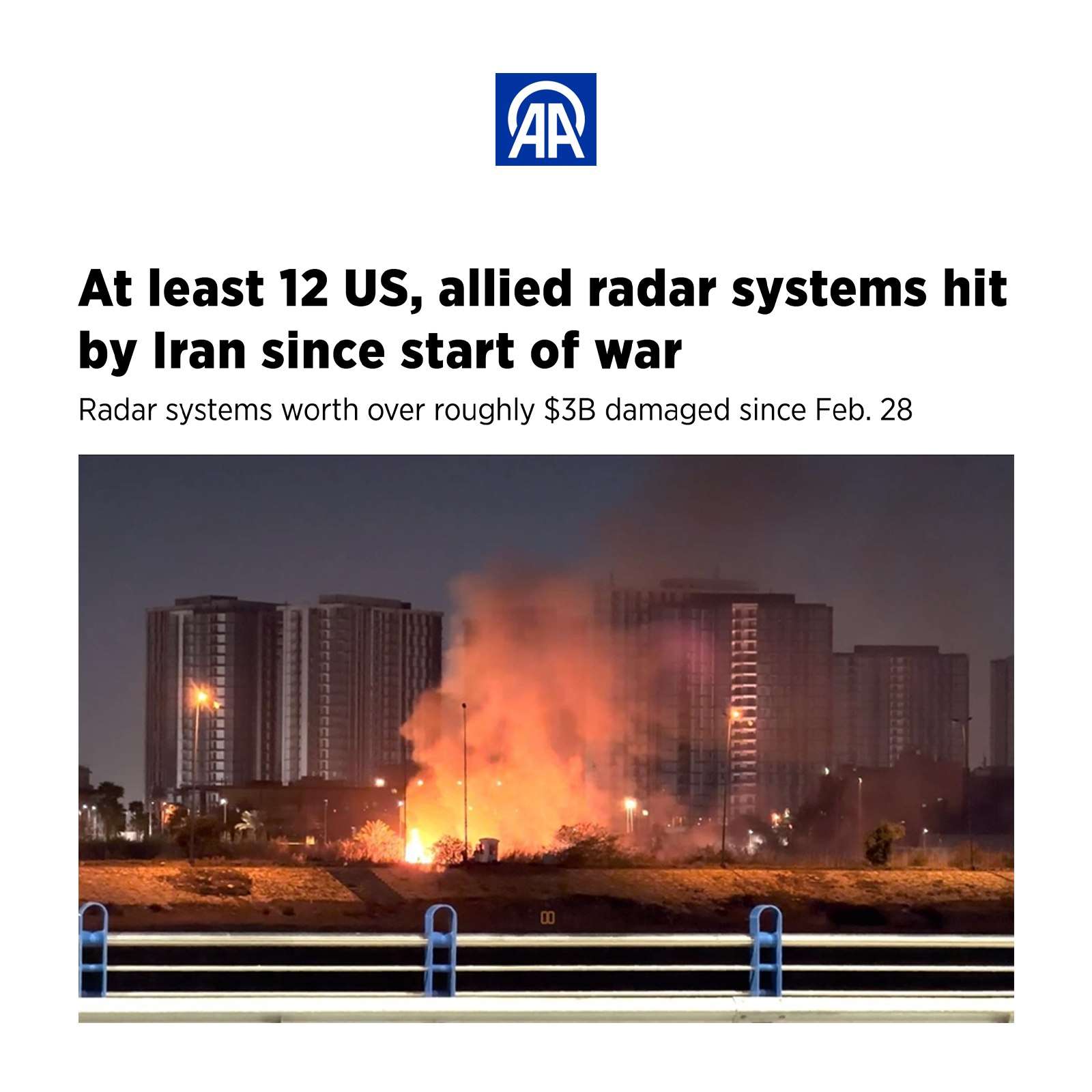 أفادت وكالة الأناضول أن إيران استهدفت منذ اندلاع الحرب ما لا يقل عن 12 منظومة رادار تابعة للولايات المتحدة وحلفائها، تُقدّر قيمتها بأكثر من 3 مليارات دولار.