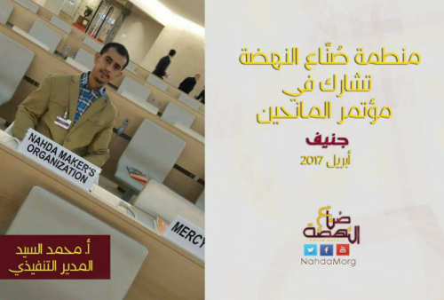 شاركت منظمة صناع النهضة، ممثلة بمديرها التنفيذي محمد السيد، في مؤتمر جنيف للمانحين، والذي نظمه مكتب الأمم المتحدة لتنسيق الشئون الإنسانية (الأوتشا).