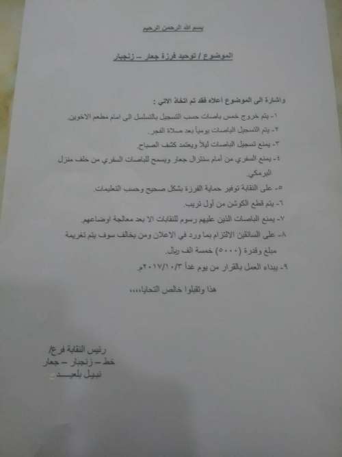 أصدرت نقابة خط جعار - زنجبار تعميماً للسائقي الباصات الأجرة بخصوص تنظيم وتوحيد فرزة جعار .