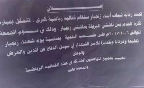وذلك بمناسبة يوم شهداء زنجبار تخليدا وعرفانا للشهداء الذين سقطوا للدفاع عن الدين والعرض والارض وندعوا جميع المواطنين المشاركة في هذه الفعالية الرياضية والدعوة عامة .