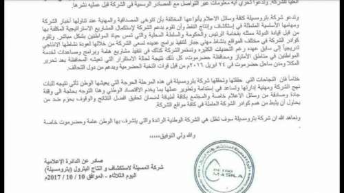 أكدت شركة بترومسيلة في بيان صادر عنها بتاريخ10/10/2017م ، ان محافظة حضرموت تشهد حالة امنية مستقرة، فيما ان الشركة تستمر بإيقاف اغلب موظفيها نظراً لعدم استتاب الحالة الامنية في المنطقة مع استقطاعات طالت مرتبات الموظفين دون اي مسوغ قانوني وصلت الى نسبة 70% .