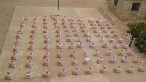 و تتكون السلة الغذائية من 3 أصناف هي كيس أرز 25 كيلو و كيس مكرونة 5 كيلو لعدد 131 اسرة من النازحين