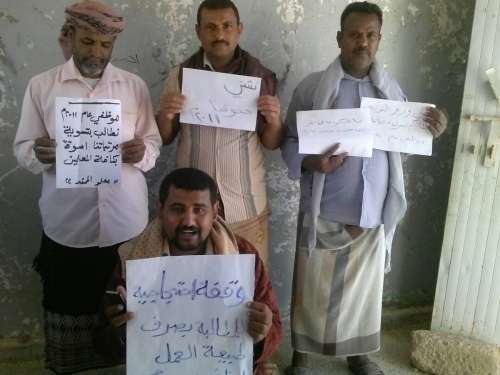 نظم عدد من معلمي مديرية المحفد بمحافظة أبين المعينيين سنة 2011 م وقفة احتجاجية لعدم صرف علاوة طبيعة العمل ومستحقاتهم الأخرى .