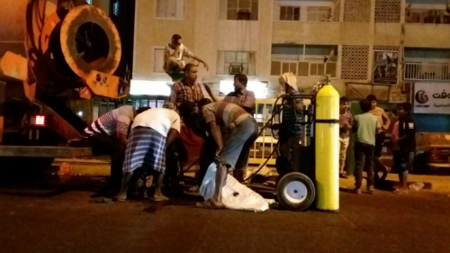 تواصل الفرق العاملة للعاملين في مياة الصرف الصحي بمديرية المعلا جهود كبيرة لتنظيف مناهل عدد من الشوارع في المديرية بعد طفح المجاري فيها .