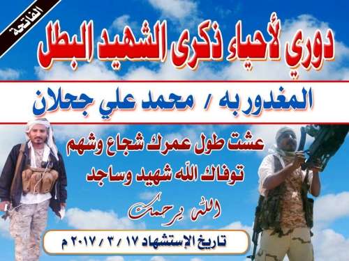 ستشهد مدينة الكود بمحافظة أبين يوم الجمعة 2018/3/30 م انطلاق دوري «الشهيد محمد علي جحلان » طيب، الله ثراه.