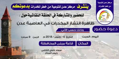 يهيب مركز عدن للتوعية من خطر المخدرات بكل الإخوة والأخوات الصحفيين والإعلاميين والكتاب والمثقفين في المواقع الصحفية والقنوات الإعلامية المرئية والسمعية للاهتمام والحضور والمشاركة وفق الدعوة المرفقة بهذا البلاغ في فعاليته الافتتاحية للحملة الشاملة التي يعد للقيام بها وتنفيذها خلال الفترة القادمة بعنوان ( حملة_عدن_تحتاجنا ) للتوعية من خطر المخدرات وذلك يوم السبت الموافق 6/ أكتوبر 2018 الساعة التاسعة صباحاً في قاعة مبنى محافظة عدن .