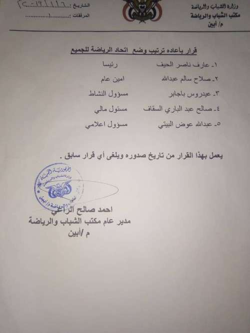 أصدر راعي رياضة أبين الكابتن أحمد صالح الراعي مدير عام مكتب الشباب والرياضة بالمحافظة قرارا بإعادة ترتيب وضع اتحاد الرياضة للجميع على النحو الآتي :