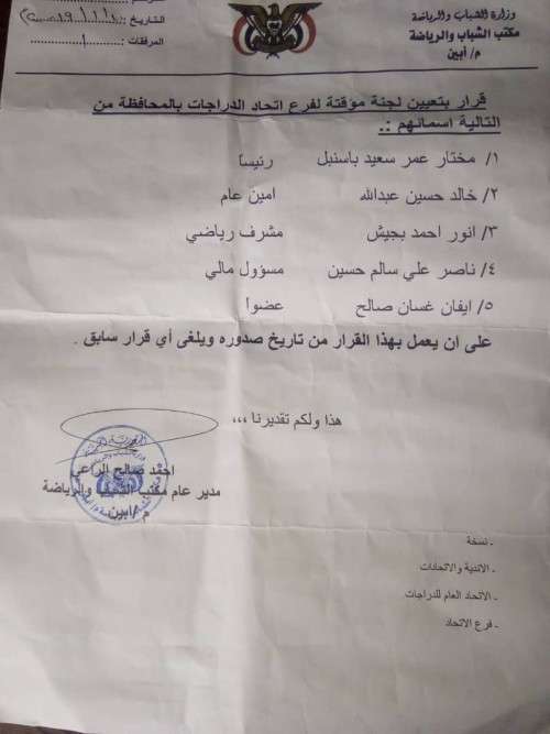 أصدر الكابتن احمد صالح الراعي مدير عام مكتب الشباب والرياضة بمحافظة ابين قرارا بتعيين لجنة مؤقتة لفرع اتحاد الدراجات بالمحافظة من التالية اسمائهم :