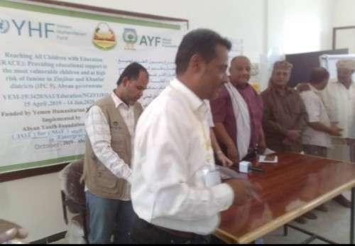 بحضور الشيخ / ناصر المنصري مدير عام مديرية خنفر والاستاذ/ عبدالمجيد الصلاحي مدير عام مكتب الاستثمار بمحافظة ابين والدكتور / فيزان بن نعم مدير مشروع دعم التعليم بمؤسسة شباب ابين وعدد من القيادات بالسلطة المحلية بابين وخنفر ومن القيادات التربوية بخنفر