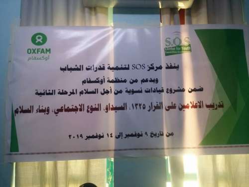 قام مركز "sos" لتنمية قدرات الشباب وبدعم من منظمة اوكسفام " بتدريب الإعلاميين على القرار 1325السيداو، النوع الاجتماعي، وبناء السلام. ياتي ذلك ضمن مشروع قيادات نسوية من اجل السلام المرحلة الثانية ، ويستمر التدريب خلال الفترة 9 - 14 / نوفمبر 2019 م .