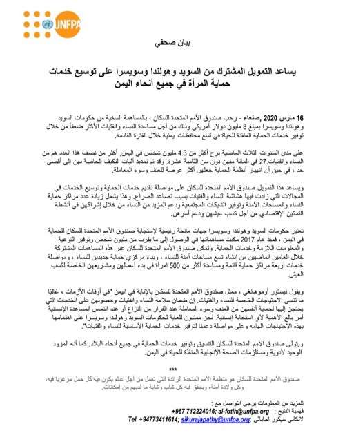 رحب صندوق الأمم المتحدة للسكان ، بالمساهمة السخية من حكومات السويد وهولندا وسويسرا بمبلغ 8 مليون دولار أمريكي وذلك من أجل مساعدة النساء والفتيات الأكثر ضعفاً من خلال توفير خدمات الحماية المنقذة للحياة في تسع محافظات يمنية خلال الفترة القادمة.