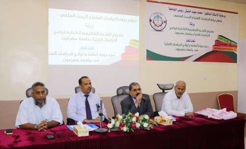 مؤكداً أن عدد البرامج الحالية 46 برنامجًا، وتم استحداث برنامجين للدكتوراه، وربط البرامج الجديدة بالجودة. وقال إن جامعة حضرموت لديها نظام جودة داخلي، وقد بدأت بترسيخ النظم واللوائح لهذه البرامج لمواكبة التطورات في مختلف المجالات، وذكر أن وزارة التعليم العالي والبحث العلمي تدرس حاليًّا تعميم نظام الجودة على بقية الجامعات اليمنية الأخرى، مشيراً إلى أن جامعة حضرموت تفتخر بما حققته من نجاح وتقدم على مستوى البرامج العلمية وبعض الامتيازات التي انفردت بها عن غيرها من الجامعات الأخرى، داعيًا المشاركين في الورشة إلى مناقشة هذا المشروع والخروج بنتائج وتوصيات لتطوير جودة برامج الدراسات العليا بالجامعة .