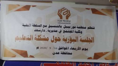 أقيم صباح اليوم في كلية المجتمع بمديرية دار سعد محافظة عدن "الجلسة البؤرية حول مشاكل التعليم" والذي تنظمها منظمة فوربيبل بالتنسيق مع السلطة المحلية وكلية المجتمع وبحضور أعضاء السلطة المحلية وممثلين من منظمات المجتمع المدني وأكاديميين و تربويين و عدد من الوسائل الإعلامية.