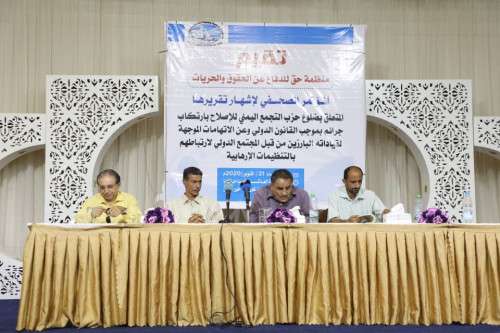 عقدت منظمة حق للدفاع عن الحقوق والحريات، اليوم الأربعاء في العاصمة عدن، مؤتمرا صحفياً لاستعراض تقريرها المتعلق بضلوع حزب التجمع اليمني للإصلاح في ارتكاب جرائم بموجب القانون الدولي والاتهامات الموجهة لقياداته لارتباطهم بالتنظيمات الإرهابية بحضور رئيس الدائرة القانونية في الأمانة العامة لهيئة رئاسة المجلس الانتقالي الجنوبي الدكتور صالح المرفدي ونائب رئيس دائرة حقوق الانسان في الأمانة العامةالدكتور عبدالعزيز علي هادي وممثلي قسم الرصد في الدائرة.