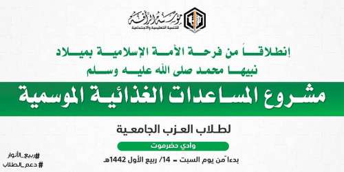 انطلاقاً من فرحة الأمة الإسلامية بميلاد نبيّها محمدٍ صلى الله عليه وسلم، اطلقت مؤسسة الرأفة للتنمية التعليمية والاجتماعية بتريم صباح هذا اليوم الأربعاء عن مشروع المساعدات الغذائية الموسمية لعزب الجامعات طلاب وادي حضرموت .