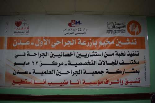 وأوضح ان هناك كثير من المرضى بحاجة ماسة لإجراء عمليات جراحية ولكن حالاتهم تختلف عن العمليات التي تقام في مخيم بازرعة ، وأكد استعداد مستشفى 22 مايو خلال المرحلة القادمة على التعاون لاستقبال و تنفيذ أكثر من مخيم والأولوية للحالات التي تم استقبالها ومعاينتها ولم يكونوا من المستهدفين في هذا المخيم . وناشد هرهرة مؤسسة بازرعة الخيرية و غيرها من الجمعيات والهيئات الأخرى لدعم المستشفى لعلاج ما تبقى من الحالات الجراحية المسجلة و الكثيرة التي هي بحاجة لعمليات جراحية في مختلف التخصصات السابق ذكرها ولم نتمكن لضمها في هذا المخيم نظرا لزيادة الحالات على العدد المستهدف .