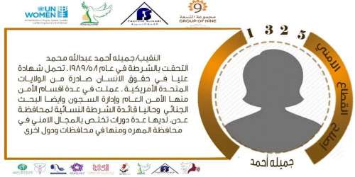 واستضافت منصة القمة النسوية وجنوبيات من اجل السلام مع إحدى الشخصيات العسكرية النقيب " جميلة احمد عبدالله محمد " قائلة : التحقت بالشرطة في عام 1/ 5/ 1989م حاصلة شهادة عليا في حقوق الإنسان صادرة من الولايات المتحدة.