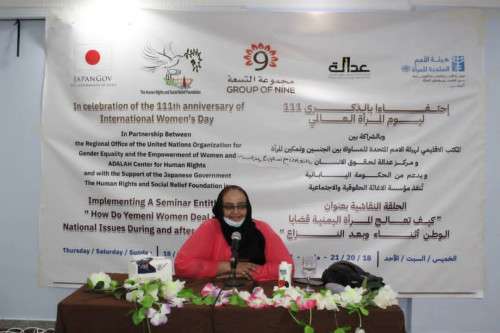 بمناسبة احتفاء بالذكرى "111" ليوم المرأة العالمي" نظمت مؤسسة الإغاثة الحقوقية والاجتماعية في قاعة المعلا بلازا بمديرية المعلا بالعاصمة عدن حلقة نقاشية بعنوان "كيف تعالج المرأة اليمنية قضايا الوطن إثناء وبعد النزاع " وبمشاركة عدد من النساء القياديات والتي تستمر خلال الفترة 18-21- مارس 2021.