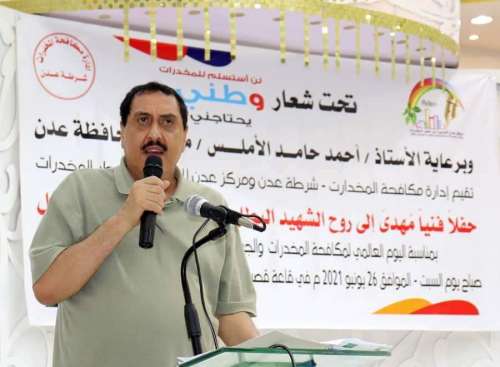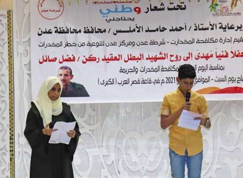 أقام مركز عدن للتوعية من خطر المخدرات وادارة مكافحة المخدرات -عدن صباح اليوم السبت الموافق 26 يونيو 2021 حفلا فنيا وخطابيا .. مهدى الى روح الشهيد البطل فضل صائل المدير السابق لإدارة مكافحة المخدرات احتوى الحفل على فقرات مميزة عبارة عن عرض حالتين واقعيتين لشباب وقعوا ضحايا تعاطي المخدرات أوصلتهما إلى مصير كاد يدمر مستقبلها .