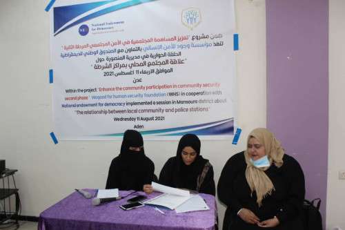 وتم تيسير الجلسة الحوارية بقيادة تهاني الصراري و فائزة احمد من خلال النقاش لمواضيع ومحاور الجلسة عن علاقة المجتمع المحلي بمراكز الشرطة في مديرية المنصورة ، وابرز مشاكل الحماية الأمنية التي يواجهها المجتمع المحلي ، وأهم الاحتياج ت والأولويات لخدمات الحماية .