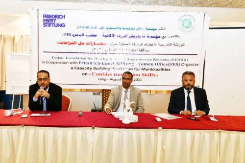 دشنت مؤسسة إمكان للتنمية والاستجابة الانسانية اليوم في عدن ورشة تدريبية حول مهارات حل النزاعات تستهدف 20 من أعضاء السلطة المحلية في محافظة لحج وذلك بالتعاون مع مؤسسة فريدريش ايبرت الالمانية وبرعاية وزير الشؤون الاجتماعية والعمل الدكتور محمد سعيد الزعوري ، وتستمر لمدة ثلاثة أيام .