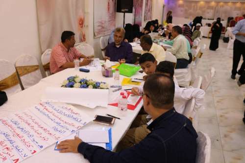 بعد ذلك توزع المشاركون في الورشة إلى مجموعات مثلت محاور مرتبطة بالعملية التعليمية، وشملت المناهج والمعلمين والطلاب، والأسرة والإدارة، حيث قامت كل مجموعة بوضع رؤى خاصة بأهداف كل محور والصعوبات التي تواجه موضوع كل مجموعة، بالإضافة إلى المعالجات الممكنة لتحسين وتطور التعليم في محور كل مجموعة.