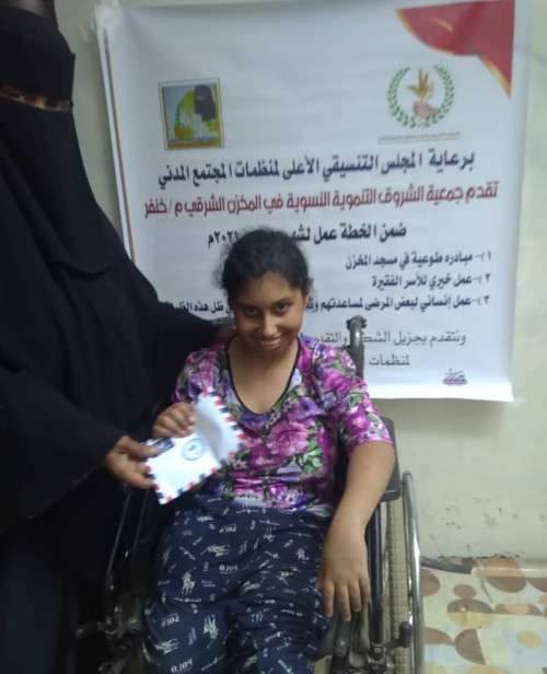 بدعم المجلس التنسيقي الاعلى لمنظمات المجتمع المدني محافظة أبين قدمت جمعية شروق التنموية بمنطقة المخزن مساعدة انسانية لاسرة معاقة بقرية المخزن.