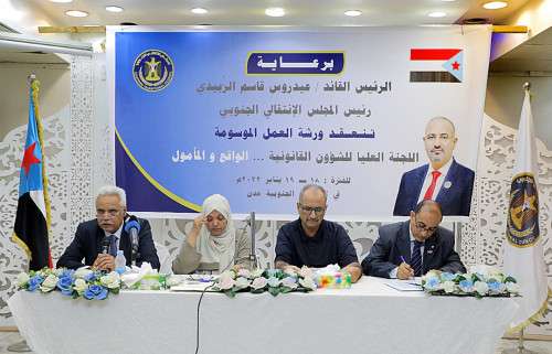 دشنت اللجنة العليا للشؤون القانونية في المجلس الانتقالي الجنوبي، اليوم الثلاثاء، في قاعة قصر العرب بالعاصمة عدن، ورشة عمل تحت عنوان " اللجنة العليا للشؤون القانونية.. الواقع و المأمول" بحضور عضوا هيئة رئاسة المجلس الأستاذ فضل محمد الجعدي نائب الأمين العام للأمانة العامة لهيئة رئاسة المجلس، والدكتورة سهير علي أحمد.