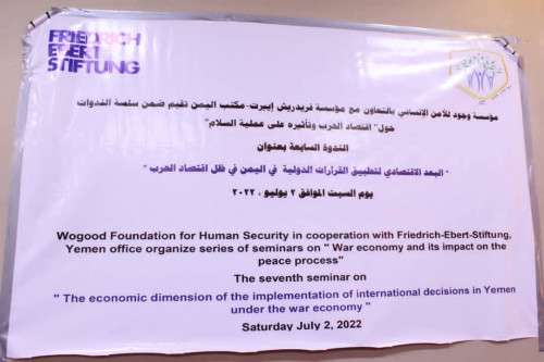 ضمن سلسلة ندوات برنامج اقتصاد الحرب وتأثيره على عملية السلام اقيمت الندوة السابعة بعنوان "البعد الاقتصادي لتطبيق القرارات الدولية في اليمن في ظل اقتصاد الحرب" بتنظيم مؤسسة وجود للأمن الإنساني بالتعاون مع مؤسسة فريدرش ايبرت – مكتب اليمن استمرت ليوم واحد بحضور أ / مها عوض - رئيسة مؤسسة وجود الأمن الإنساني ، أ / محمود قياح – مدير مؤسسة فريدرش ايبرت، أ/ دينا المأمون – مديرة منظمة سيفيك وبمشاركة عددا من الاختصاصين والاكاديميين والاقتصاديين وممثلي الجهات الحكومية والقطاع الخاص ومنظمات المجتمع المدني والمنظمات الدولية والاعلام.