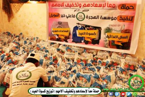 في أوائل العشر من ذي الحجة المباركة، وقرب عيد الأضحى المبارك، من منطلق ذلك دشنت مؤسسة الهجرة الخيرية للتنمية بالعاصمة عدن أولى أعمال حملتها السنوية الخيرية "معاً لإسعادهم وتخفيف آلامهم" لهذا العام 1443هـ - 2022م، وذلك البدء بأولى الأعمال "توزيع كسوة العيد" لمستحقيها من أطفال أسر النازحين بالعاصمة عدن
