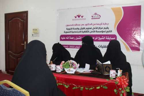 اختتمت بمركز الأمل التابع لمؤسسة الأمل الثقافية الاجتماعية النسوية بالمكلا مسابقة الشيخ عبدالله الشبل السادسة في مجال حفظ القرآن الكريم بمشاركة نحو ( 70 ) مشاركا من النساء والفتيات و الأطفال ، وذلك برعاية كريمة من الدكتور عمر عبدالله بامحسون سفير النوايا الحسنة ، رئيس مجلس أمناء مؤسسة الأمل .