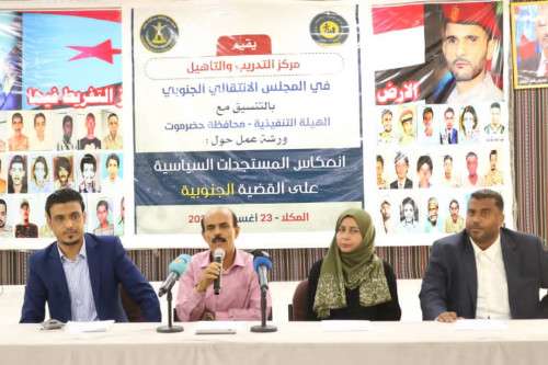 نظم مركز التدريب والتأهيل في المجلس الانتقالي الجنوبي، بمدينة المكلا، اليوم الثلاثاء، بالتنسيق مع الهيئة التنفيذية لانتقالي حضرموت، ورشة عمل سياسية بعنوان "انعكاسات المستجدات السياسية على القضية الجنوبية".