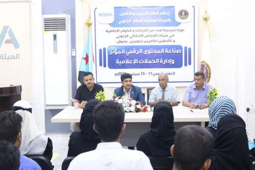 اختتم قطاع التدريب والتأهيل بالهيئة الوطنية للإعلام الجنوبي، اليوم الأربعاء 14 سبتمبر ، في مركز التدريب الإعلامي بالعاصمة عدن، الدورة التدريبية في "صناعة المحتوى الرقمي وإدارة الحملات الإعلامية" لقيادات وإعلاميي هيئات المجلس الانتقالي الجنوبي والنشطاء الإعلاميين الجنوبيين، برعاية كريمة من الرئيس القائد عيدروس قاسم الزُبيدي رئيس المجلس الانتقالي الجنوبي.