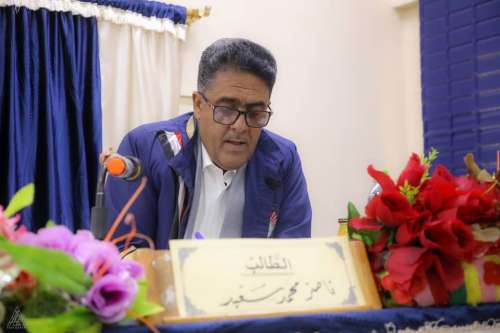 وكانت لجنة المناقشة المكونة من أ.د. خالد عبدالله طوحل، رئيساً ومشرفاً علمياً، و أ.د. محمد رجب جرادة، عضواً ومناقشاً داخلياً، و أ. مشارك د. مهدي راشد القباص، عضواً ومناقشاً خارجياً من جامعة شبوة، قد أشادت بالرسالة المقدمة من الباحث ناصر محمد سعيد وبمضمونها وما احتوته من تفاصيل، معبرة عن تقديرها للجهد الكبير الذي بذله الباحث ومثابرته في اعداد هذه الرسالة العلمية وماقدم فيها من معلومات قيمة يستحق عليها الثناء والتقدير.