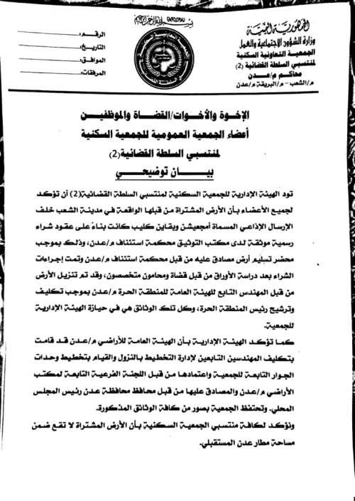 أصدرت الهيئة الإدارية للجمعية السكنية لمنتسبي السلطة القضائية في عدن بيانا أوضحت فيه حول الأرض المخصصة للجمعية.