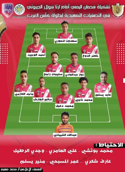 أعلن المدرب الوطني الكابتن وليد النزيلي عن تشكيلة فريق فحمان اليمني أمام ارتا سولار الجيبوتي وهي كما يلي :