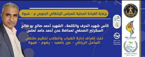 بتوجيهات العميد علي أحمد الجبواني رئيس الهيئة التنفيذية للقيادة المحلية للمجلس الانتقالي الجنوبي م/شبوة، أعلنت إدارة الشباب والطلاب بتنفيذية انتقالي شبوة رعايتها لبطولة كأس شهيد الحرف والكلمة أحمد بو صالح للفرق الشعبية بملتقى الساحل الرياضي مديرية رضوم