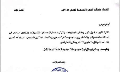 وأكد التعميم على منع إرسال أية مجموعات جديدة من قبل منشآت ومكاتب العمرة.