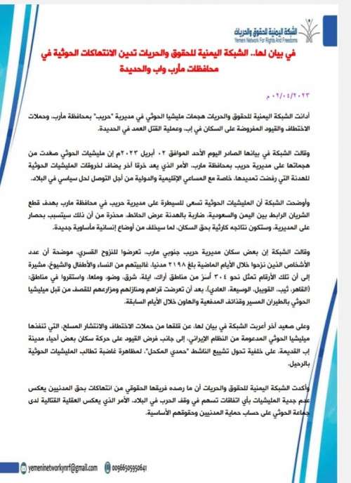 أدانت الشبكة اليمنية للحقوق والحريات هجمات مليشيا الحوثي في مديرية "حريب" بمحافظة مأرب، وحملات الاختطاف والقيود المفروضة على السكان في إب، وعملية القتل العمد في الحديدة.