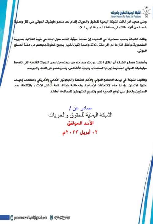 وعلى صعيد آخر أدانت الشبكة اليمنية للحقوق والحريات إقدام أحد عناصر مليشيات الحوثي على قتل وإصابة خمسة من أفراد عائلته في محافظة الحديدة غربي البلاد.
