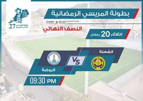 تلعب، مساء اليوم الثلاثاء، ثاني مواجهات الدور نصف النهائي من بطولة كأس المريسي الرمضانية بنسختها الـ27 والتي تقام برعاية المجلس الانتقالي الجنوبي، وبإشراف مكتب الشباب والرياضة بعدن وبتنظيم اتحاد كرة القدم فرع عدن، بمشاركة 24 فريقاً من عدد من المحافظات إلى جانب أندية العاصمة عدن، وتقام جميع مبارياتها على ملعب الحبيشي.