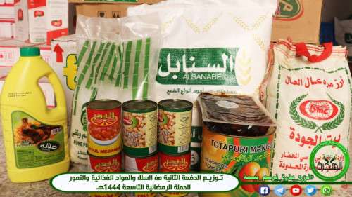حيث تمت آلية التوزيع على مراحل بداية بتوزيع 290 سلة غذائية متكاملة محتوية على (الارز والدقيق والسكر والتمر والمنجا والفاصوليا والفول والزيت والمكرونة)، ومن ثم توزيع سلل غذائية محتوية على (الدقيق والأرز والتمر والفاصوليا والفول والمنجا)، كما تم توزيع مواد غذائية لأكثر من 600 أسرة على حده محتوية على (المنجا والفول والفاصوليا والتمر)، والتي جاءت بدعم سخي من فاعلي خير.