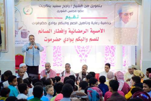 نظمت جمعية رعاية وتأهيل الصم والبكم بوادي حضرموت، اليوم السبت، أمسية رمضانية وإفطار الصائم، بتمويل من الشيخ راجح سعيد باكريت عضو مجلس الشورى.