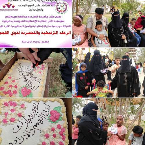 نظم مكتب مؤسسة الأمل فرع محافظة أبين والتابع لمؤسسة الأمل الثقافية الاجتماعية النسوية محافظة حضرموت بالشراكة مع جمعية صناع الإرادة لرعاية وتأهيل المعاقين بالكود بمديرية خنفر محافظة أبين عصر اليوم الخميس الرحلة الترفيهية والتحفيزية العيدية لذوي الهمم للعاصمة زنجبار بمنتزة ساحة الشهداء شارك في هذه الرحلة الاطفال وأولياء أمورهم .
