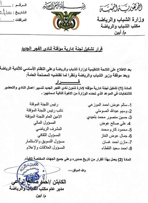أصدر مدير عام مكتب الشباب والرياضة بأبين،الكابتن أحمد صالح الراعي قرارا بتشكيل لجنة مؤقتة لنادي الفجر الجديد،وذلك بعد استقالة الإدارة السابقة للنادي.