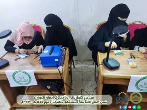 ضمن أعمال حملة معاً لإسعادهم وتخفيف آلآمهم وبتنظيم وتنسيق مؤسسة الهجرة الخيرية للتنمية وبتمويل من فاعل خير ، أقيمت في مركز إبداع للتدريب والتأهيل التابع لمؤسسة الهجرة الدورة التدريبية المكثفة للفتيات ، في برمجة وصيانة الجوالات ، بالعاصمة عدن .