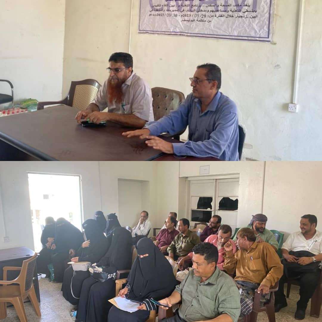 وخلال اللقاء الذي حضره مدير عام مكتب الصحة بالمحافظة د. صالح الثرم ومدير برنامج التغذية بالمحافظة كمال جبران تم مناقشة الصعوبات والمعوقات التي تواجه سير عمل برنامج التغذية على مستوى المديريات وتقديم خدمات التغذية في المرافق الصحية.