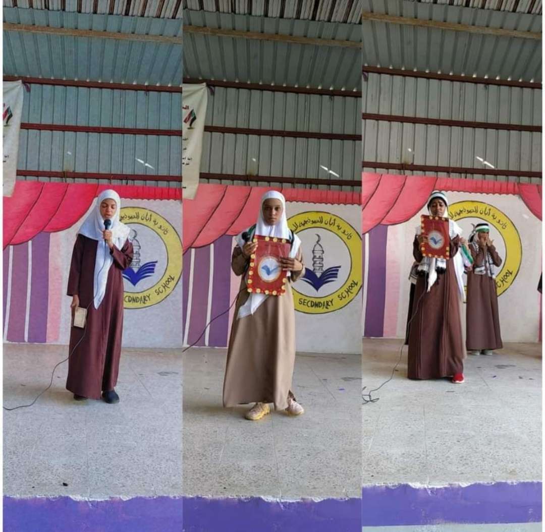 ثم قدمت الطالبات مقطوعات شعرية ، واغاني فلسطينية حزينة تعبر عن دما۽ وشهدا۽ أطفال فلسطين في عملية " طوفان الاقصﯼ " ويليه مشهد تمثيلي بين تهديد اليهود وشهامة وعزيمة ورجولة الفلسطينين بعدم الرضوخ أو الاستسلام لليهود.