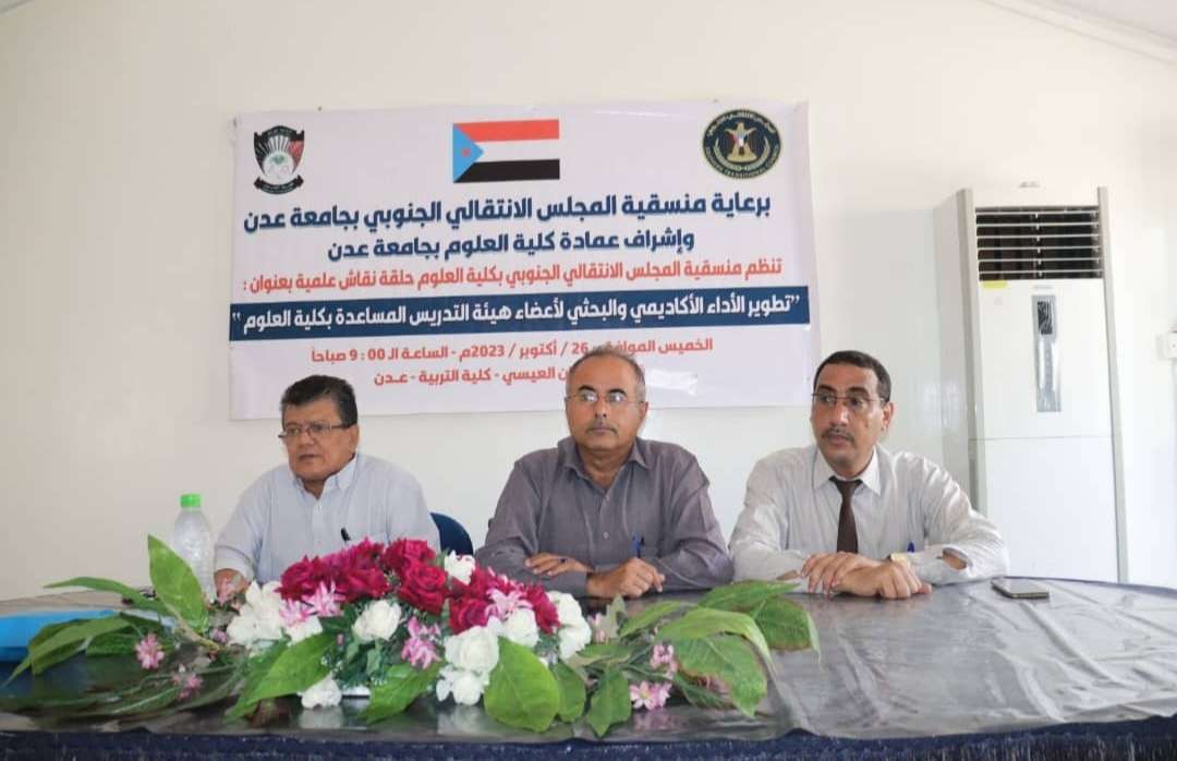 نظمت منسقية المجلس الانتقالي الجنوبي في كلية العلوم بجامعة عدن، يوم الخميس، حلقة نقاشية علمية بعنوان "تطوير الأداء الأكاديمي والبحثي" لأعضاء هيئة التدريس المساعدة بالكلية.